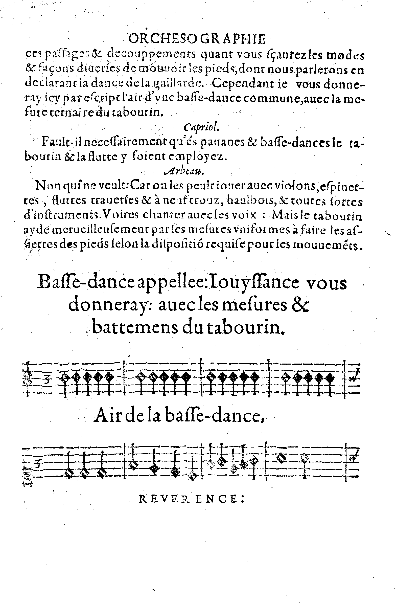 Quand on sçais les marches & mouvements d'une pavane & d'une basse-dance commune, on peult dancer toutes les aultres: Car encores qu'elles soient differentes en airs, & qu'elles sont chantées ou jouees diversement, elles sont semblables en mesure. C'est donc afaire aux joueurs d'instruments d'en apprendre de plusieurs sortes: & quand à vous, il vous doibt suffire de sçavoir comme il les fault dancer, ce qui vous est maintenant facile, parce qu'en avez apris & entendu.