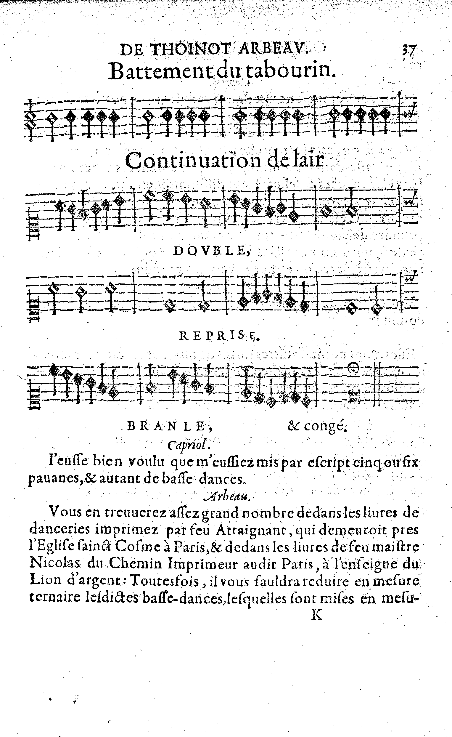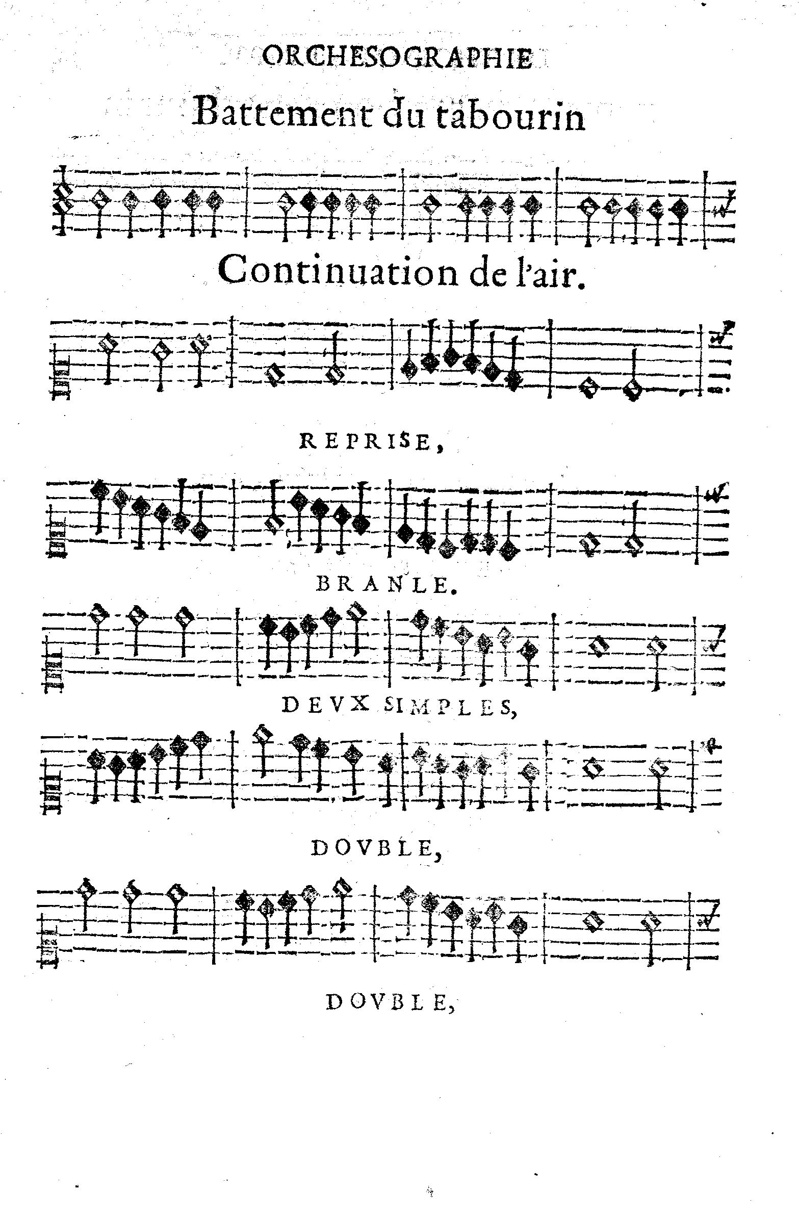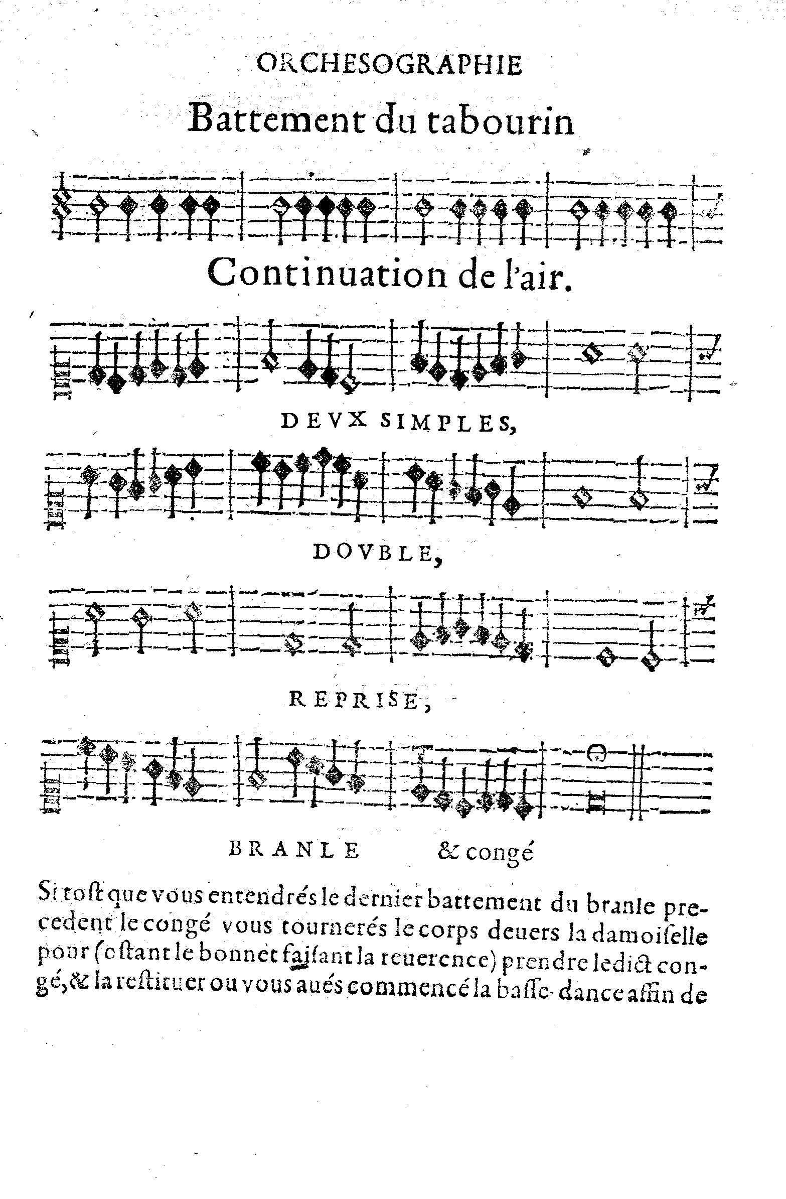 Non qui ne veult: Car on les peult jouer avec violons, espinettes, fluttes traverses & à neuf trouz, haulbois, & toutes sortes d'instruments: Voires chanter avec les voix: Mais le tabourin ayde merveilleusement par ses mesures uniformes à faire les assiettes des pieds selon la disposition requise pour les mouvements.