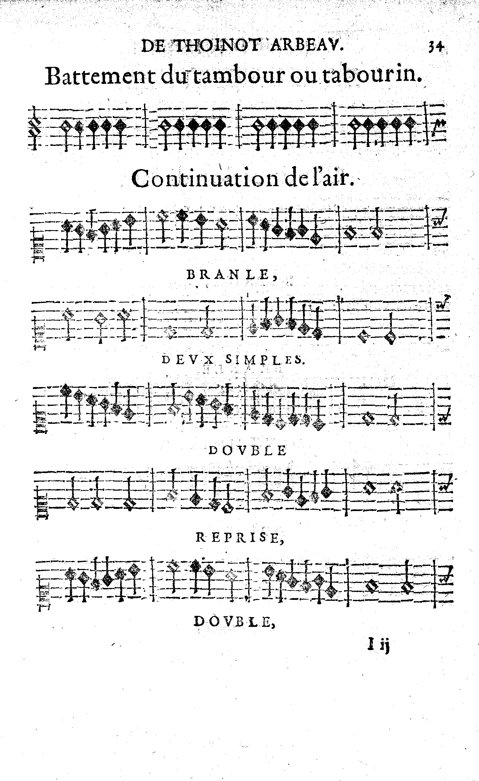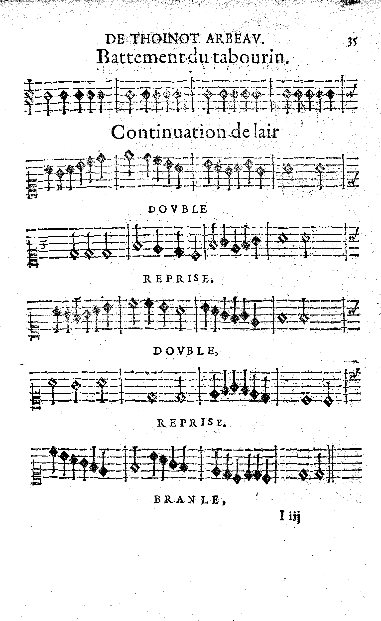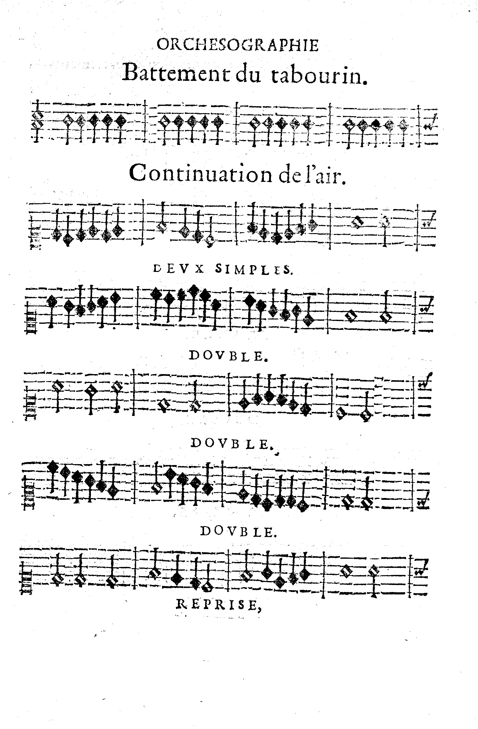 Non qui ne veult: Car on les peult jouer avec violons, espinettes, fluttes traverses & à neuf trouz, haulbois, & toutes sortes d'instruments: Voires chanter avec les voix: Mais le tabourin ayde merveilleusement par ses mesures uniformes à faire les assiettes des pieds selon la disposition requise pour les mouvements.