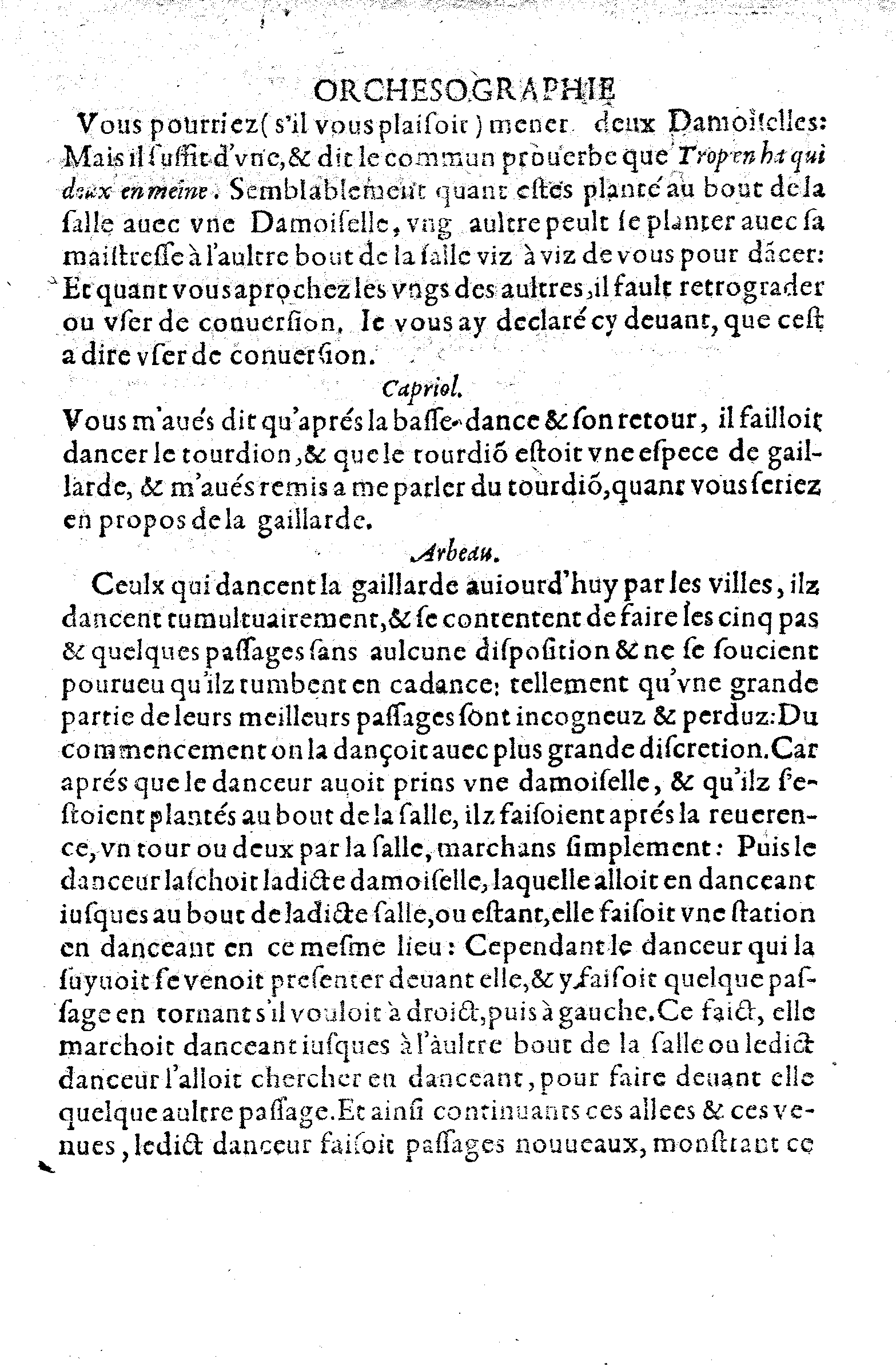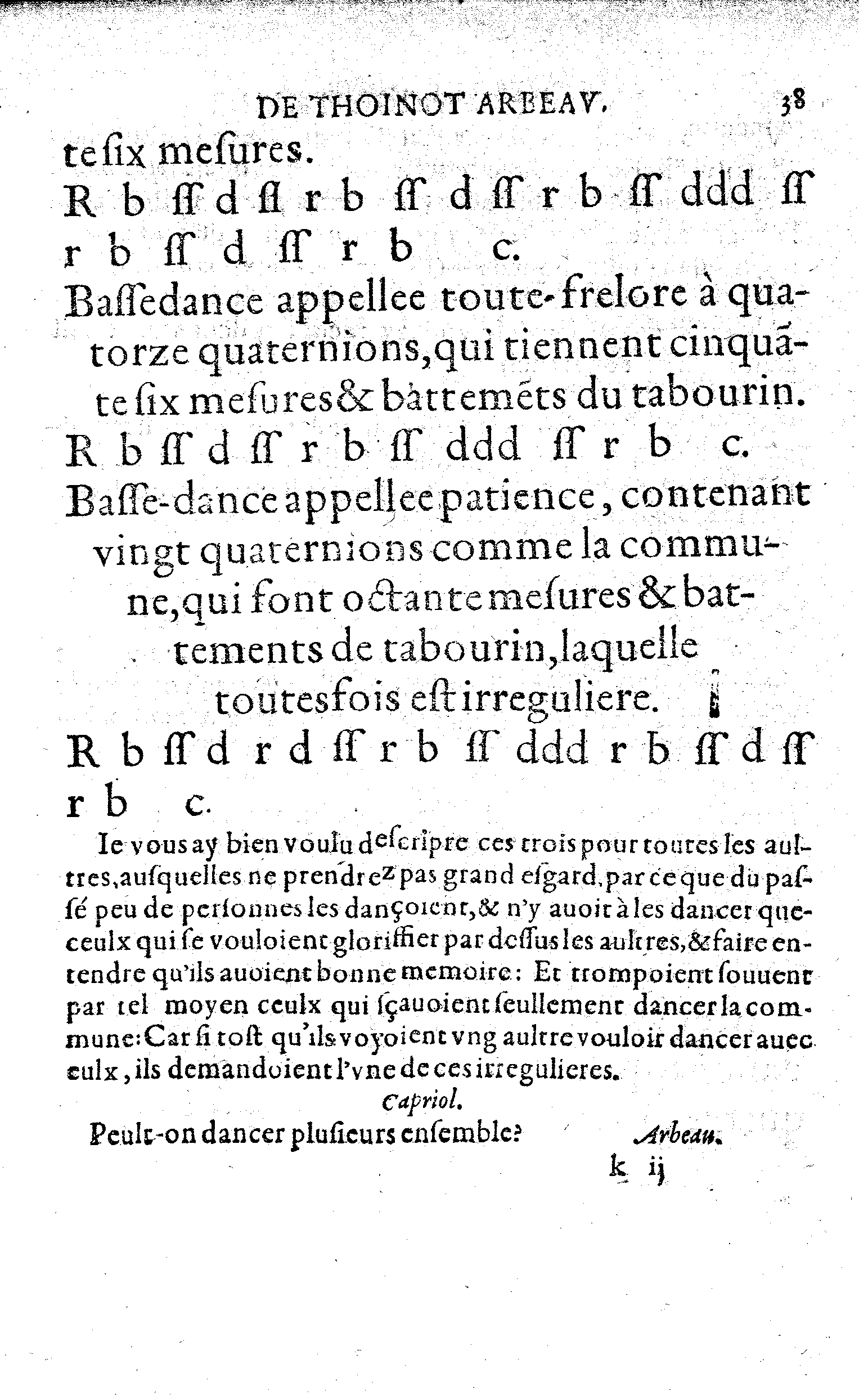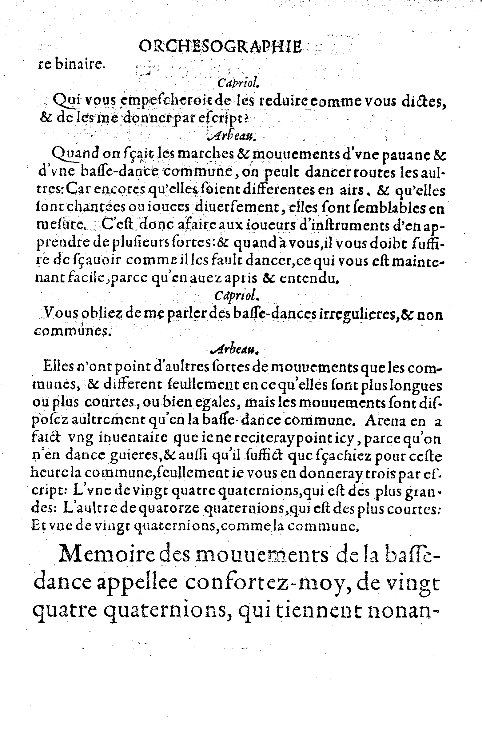 Je vous ay bien voulu descripre ces trois pour toutes les aultres, ausquelles ne prendrez pas grand esgard par ce que du passé peu de personnes les dançoient, & n'y avoit à les dancer que-ceulx qui se vouloient gloriffier par dessus les aultres, & faire entendre qu'ils avoient bonne memoire: Et trompoient souvent par tel moyen ceulx qui sçavoient seullement dancer la commune: Car si tost qu'ils voyoient ung aultre vouloir dancer avec eulx, ils demandoient l'une de ces irregulieres.