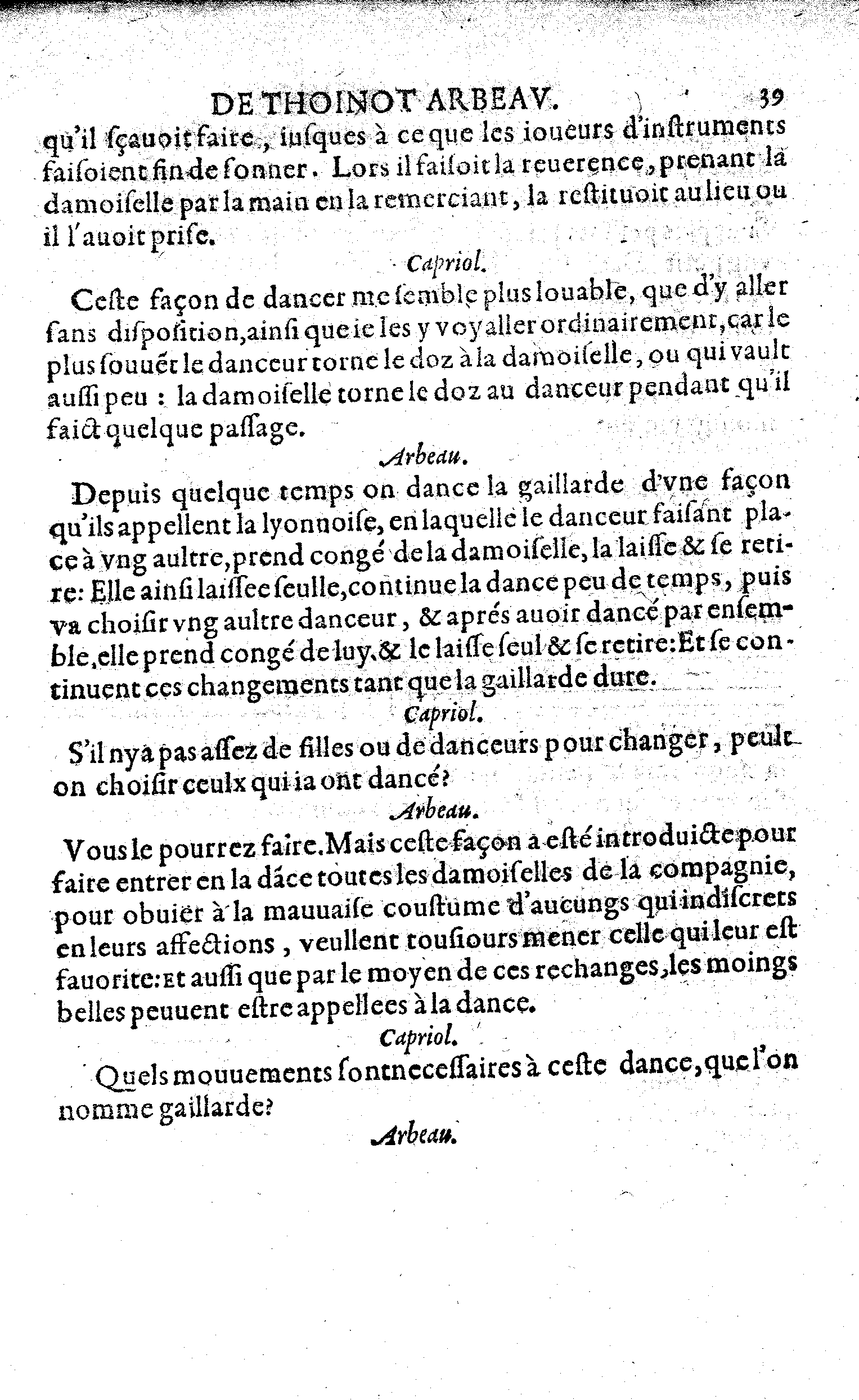 Depuis quelque temps on dance la gaillarde d'une façon qu'ils appellent la lyonnoise, en laquelle le danceur faisant place à ung aultre, prend congé de la damoiselle, la laisse & se retire: Elle ainsi laissee seulle, continue la dance peu de temps, puis va choisir ung aultre danceur, & aprés avoir dancé par ensemble, elle prend congé de luy, & le laisse seul & se retire: Et se continuent ces changements tant que la gaillarde dure.