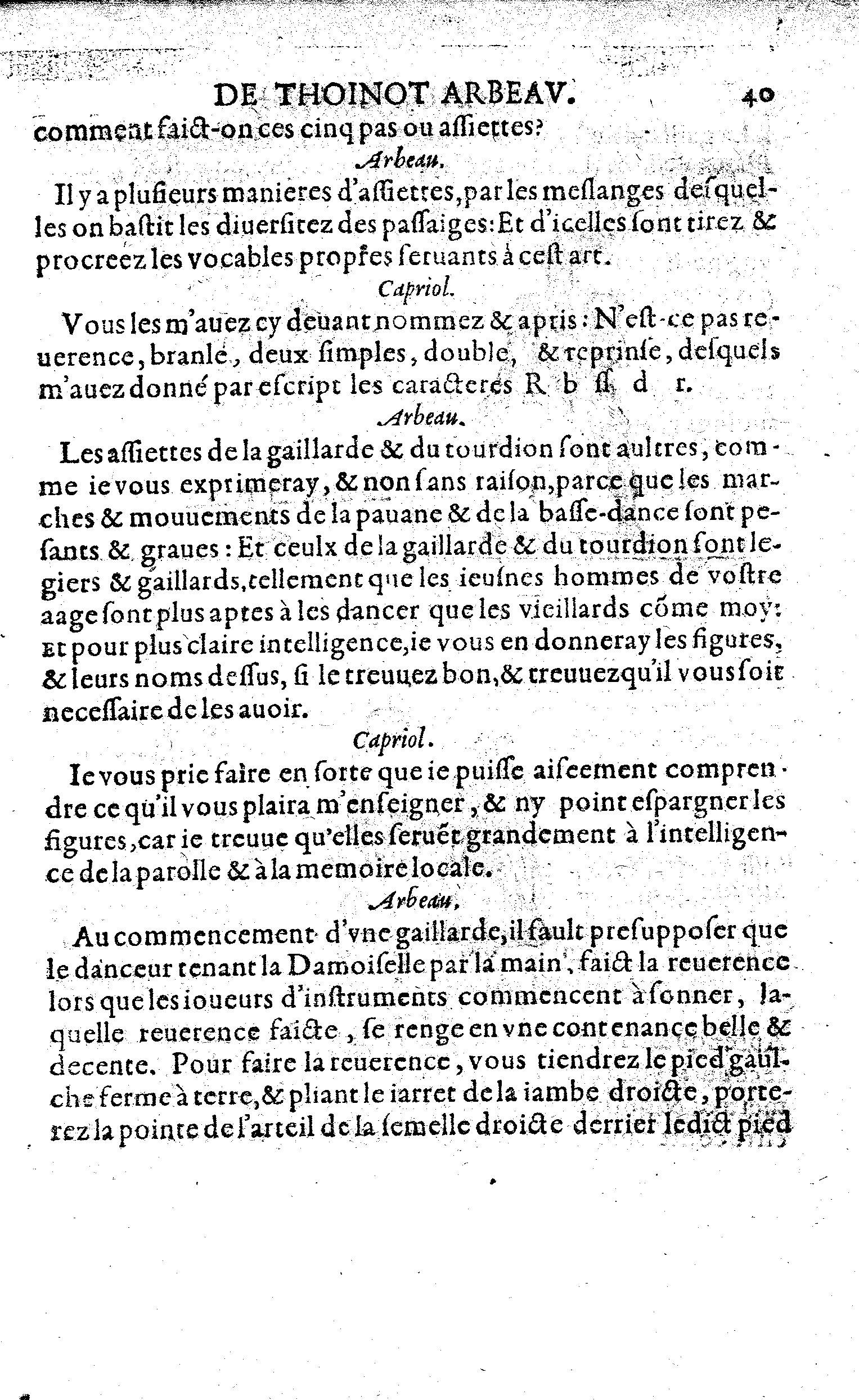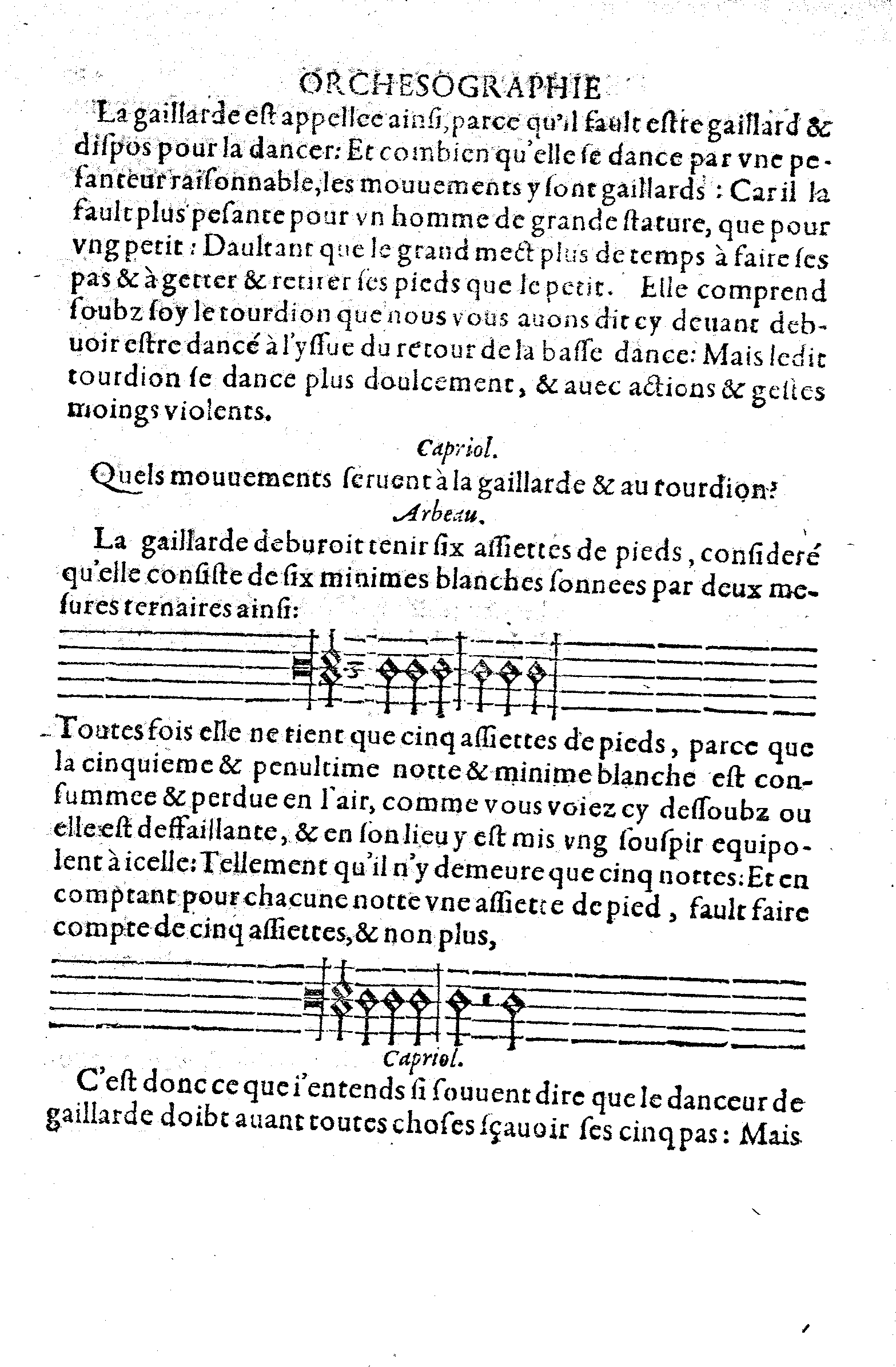 Les assiettes de la gaillarde & du tourdion sont aultres, comme je vous exprimeray, & non sans raison, parce que les marchez & mouvements de la pavane & de la basse-dance sont pesants & graves: Et ceulx de la gaillarde & du tourdion sont legiers & gaillards, tellement que les jeusnes hommes de vostre aage sont plus aptes à les dancer que les vieillards comme moy: Et pour plus claire intelligence, je vous en donneray les figures, & leurs noms dessus, si le treuvez bon, & treuvez qu'il vous soit necessaire de les avoir.
