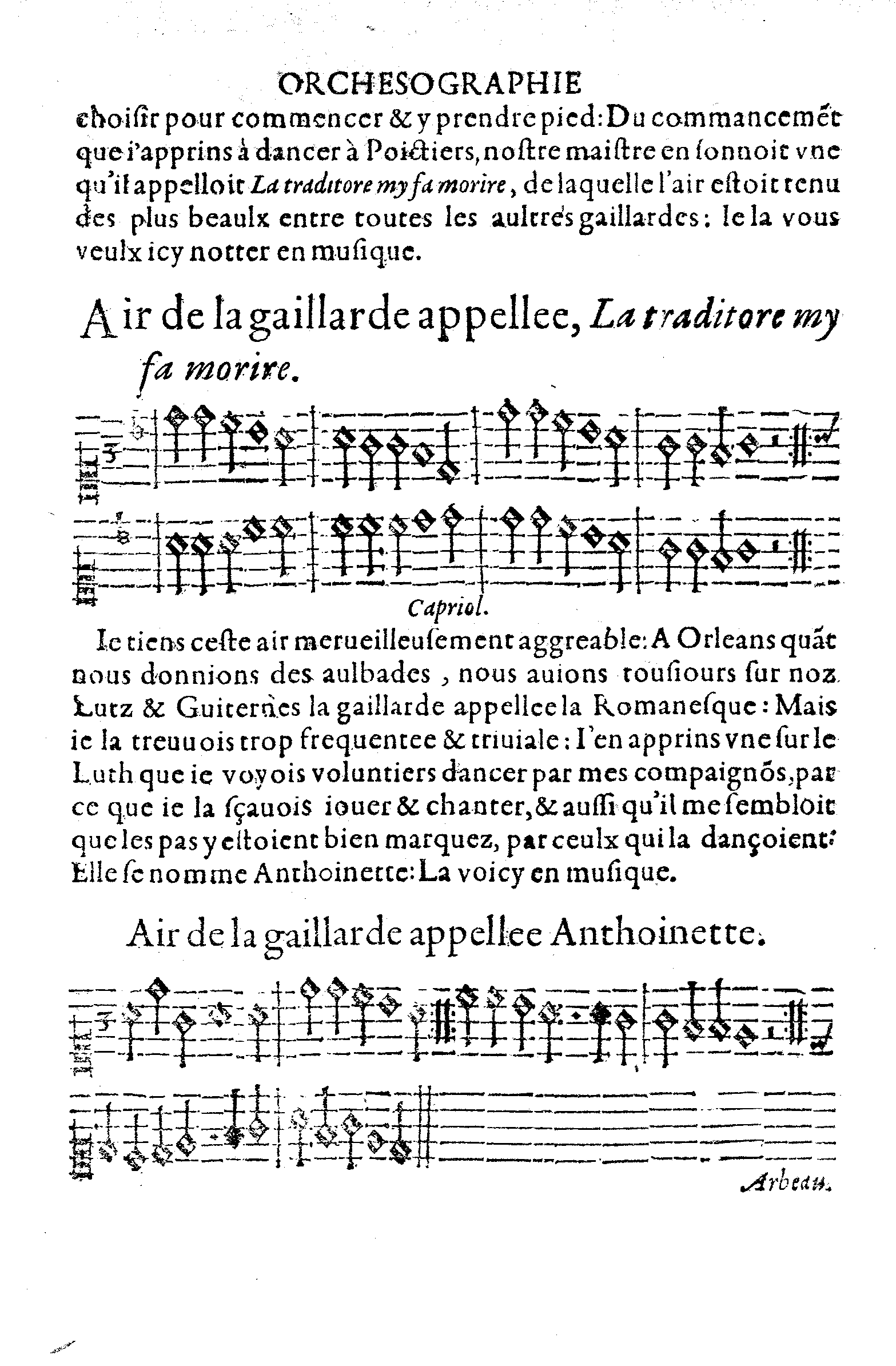 Je tiens ceste air merveilleusement aggreable: A Orleans quant nous donnions des aulbades, nous avions tousjours sur noz Lutz & Guiternez la gaillarde appellee la Romanesque: Mais je la treuvois trop frequentee & triviale: J'en apprins une sur le Luth que je voyois volontiers dancer par mes compaignons, par ce que je la sçavois jouer & chanter, & aussi qu'il me sembloit que les pas y estoient bien marquez, par ceulx qui la dançoient: Elle se nomme Anthoinette: La voicy en musique.