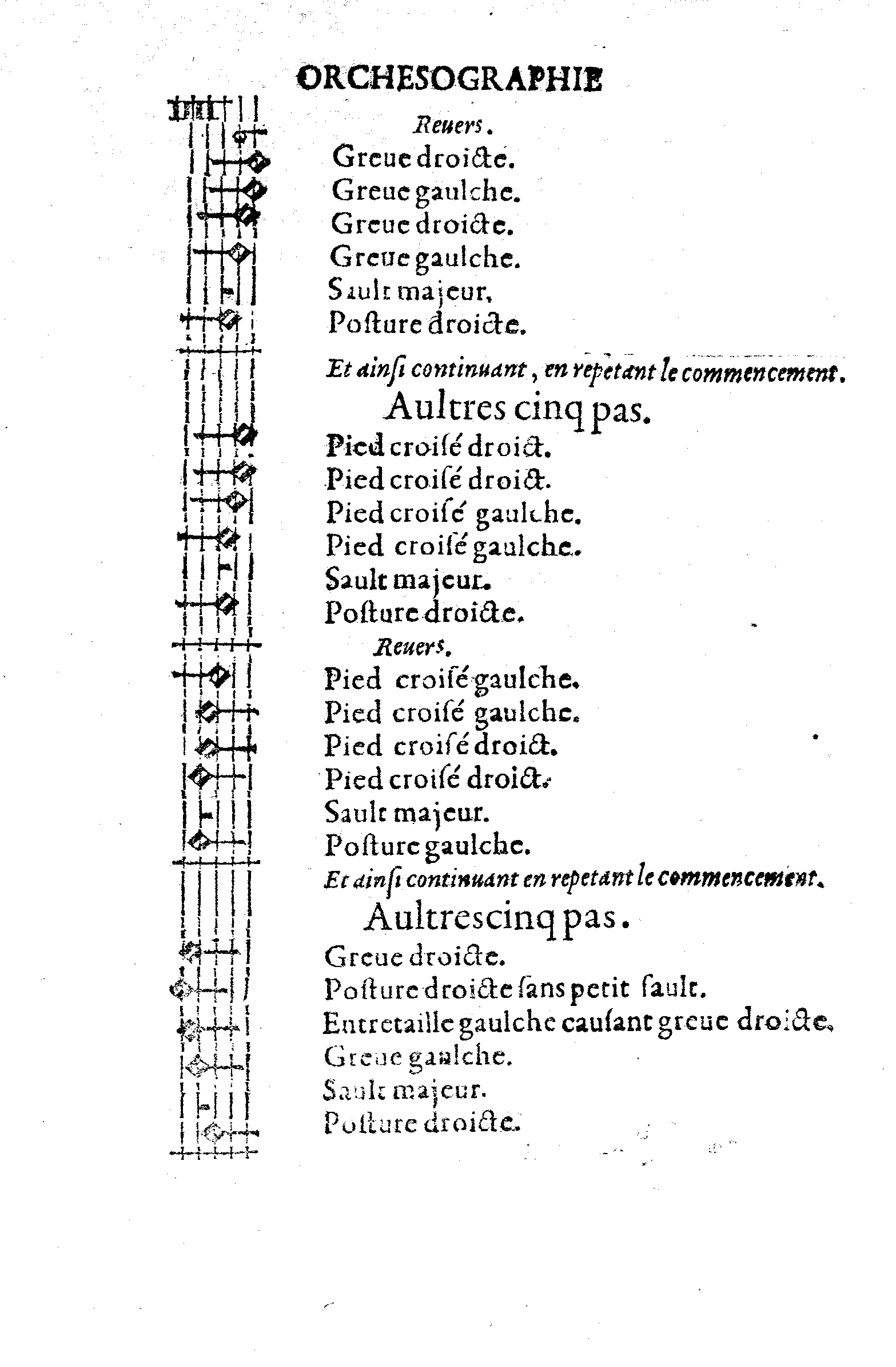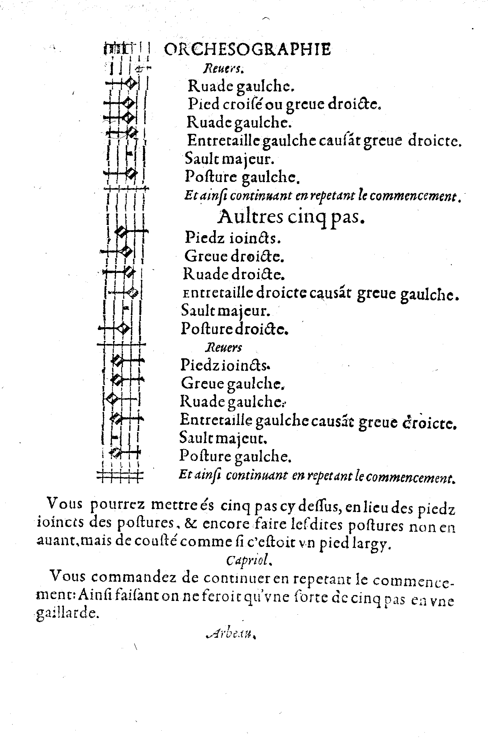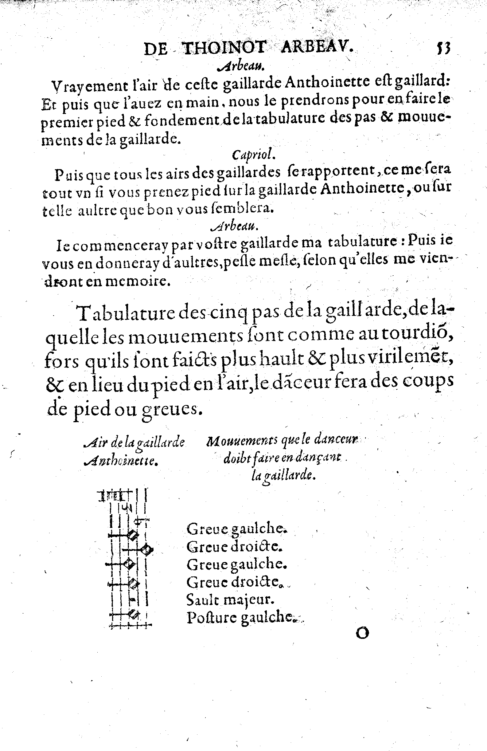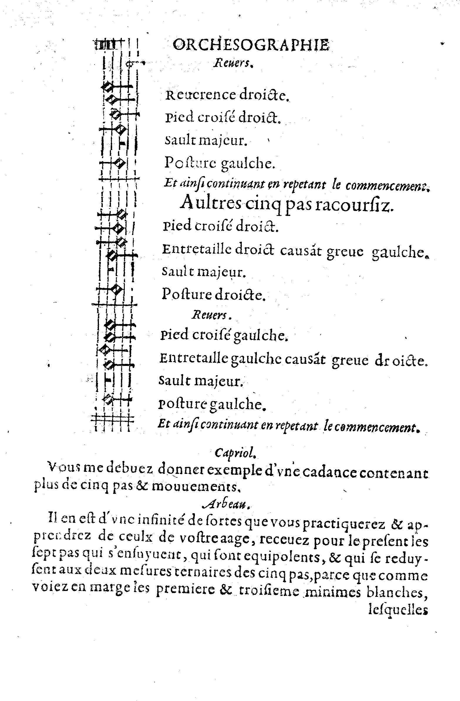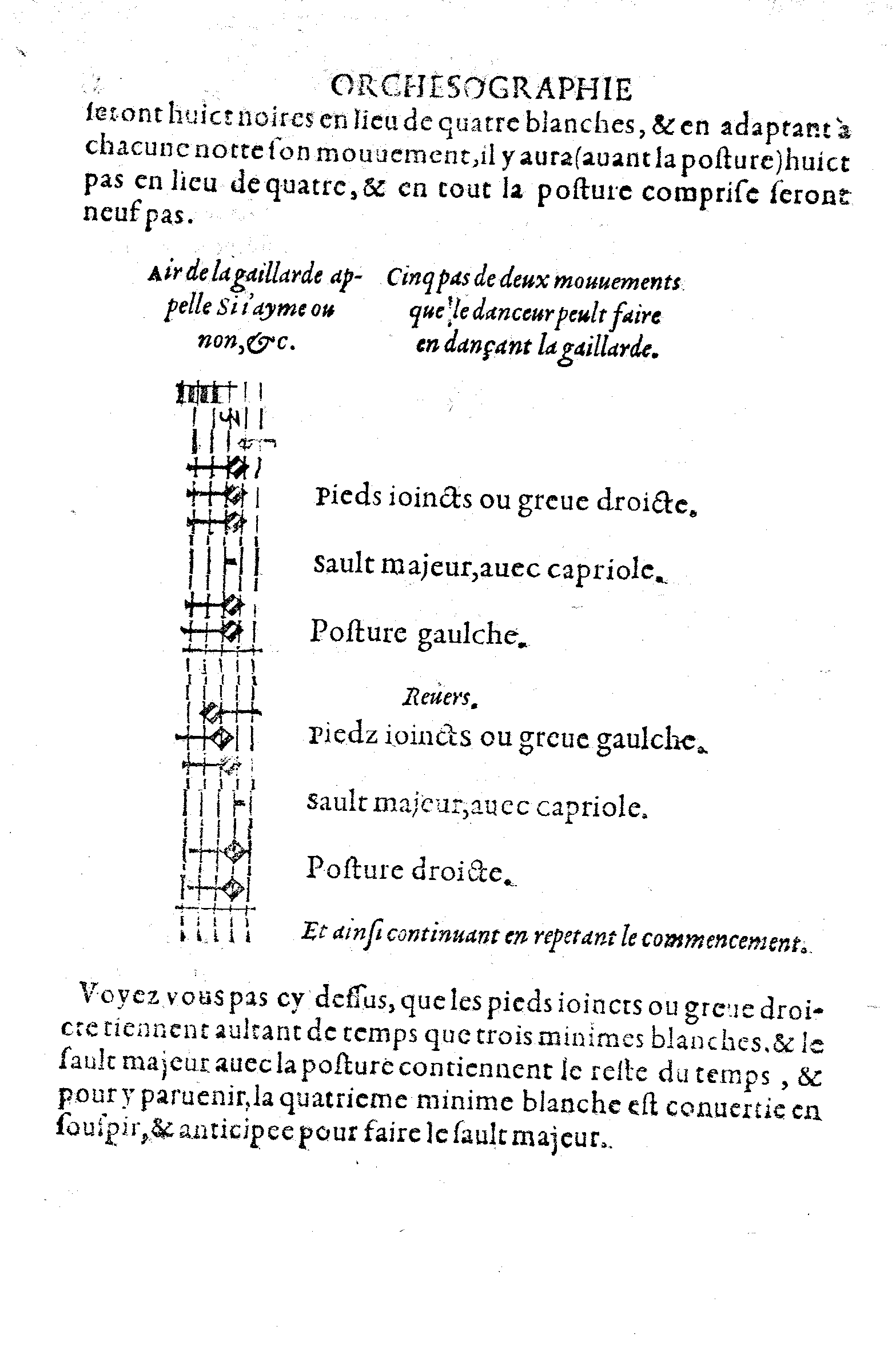 Considerez surce que dessus, que la greve tient deux minimes blanches, l'entretaille faisant greve, tient deux aultres minimes blanches, le sault majeur tient le souspir, equipolent à une minime blanche, & la posture le temps d'une aultre minime blanche: Et ainsi tous lesdits cinq pas sont reduits & racoursiz à trois pas, equipolents à cinq.