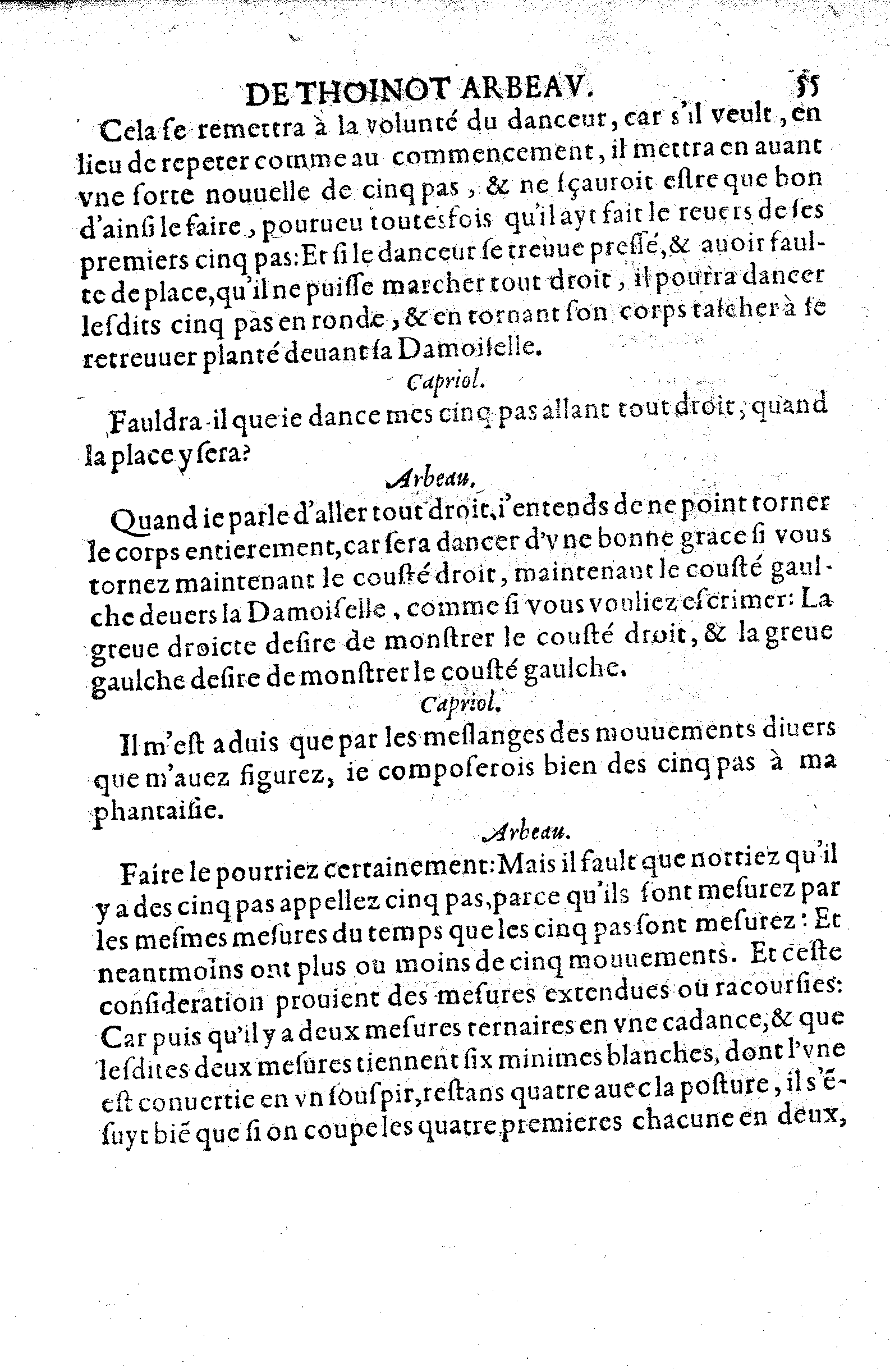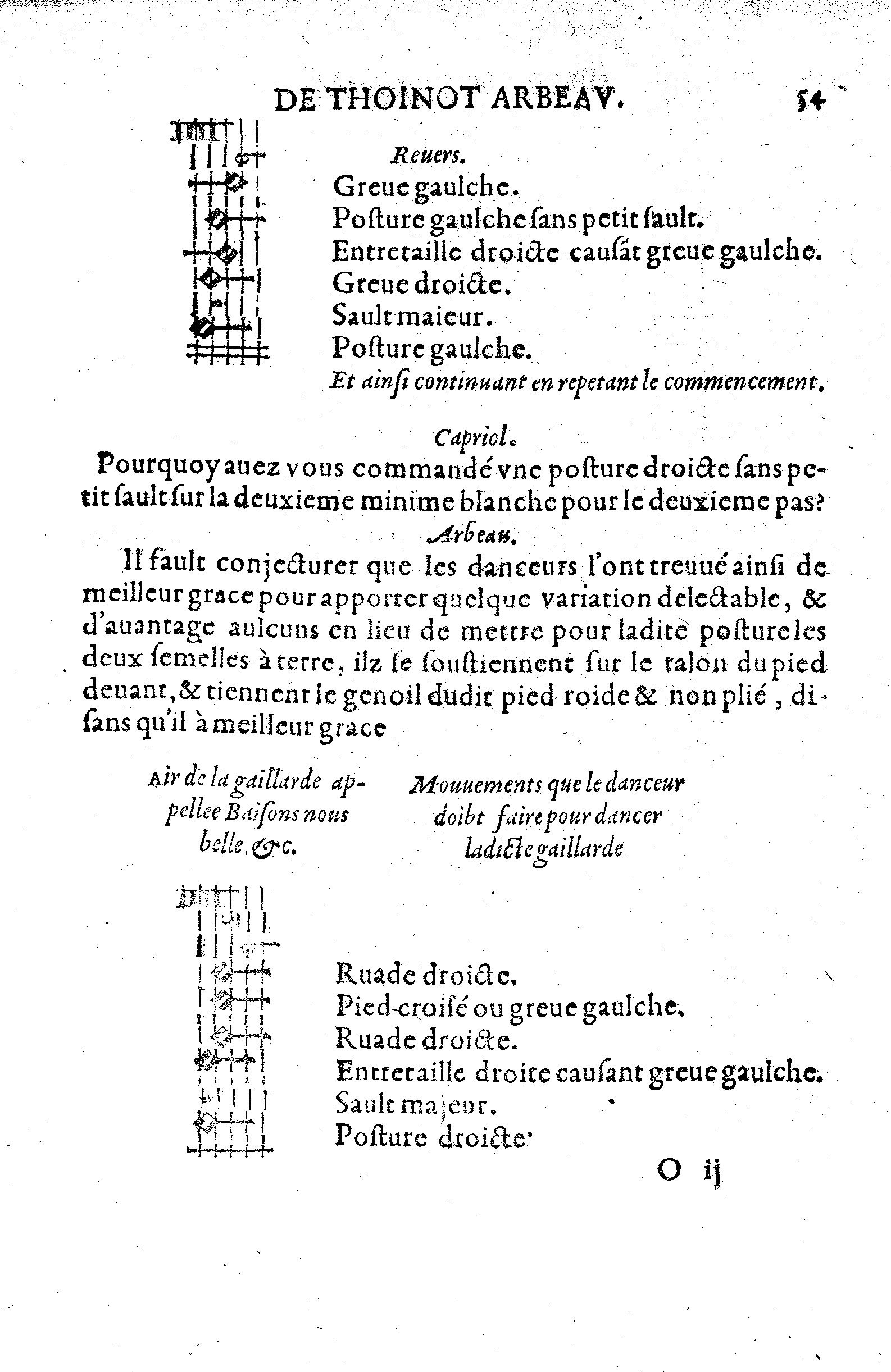 Quand je parle d'aller tout droit, j'entends de ne point torner le corps entierement, car sera dancer d'une bonne grace si vous tornez maintenant le cousté droit, maintenant le cousté gaulche devers la Damoiselle, comme si vous vouliez escrimer: La greve droicte desire de monstrer le cousté droit, & la greve gaulche desire de monstrer le cousté gaulche.