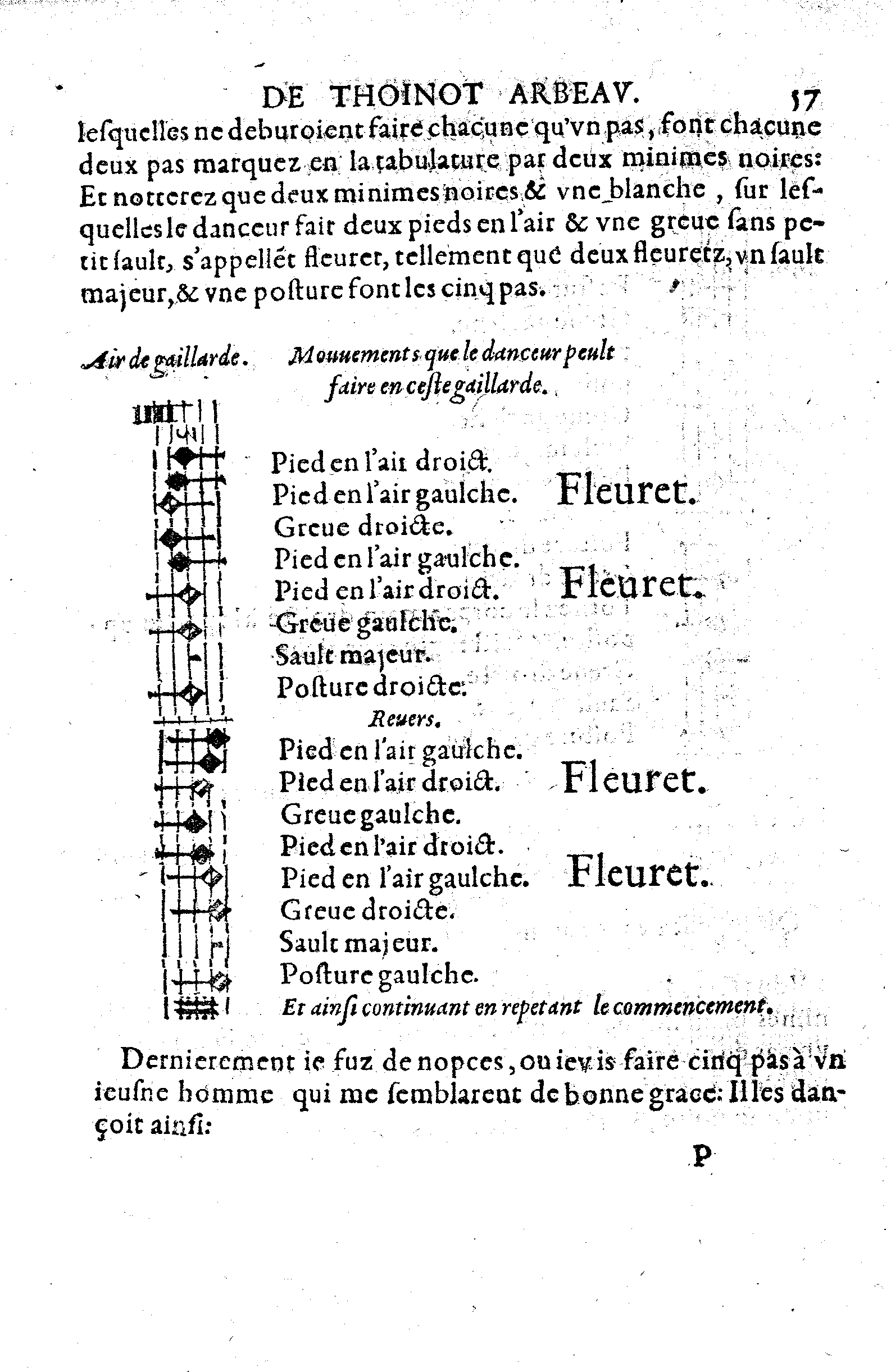 Dernierement je fuz de nopces, ou jevis faire cinq pas à un jeusne homme qui me semblarent de bonne grace: Il les dançoit ainsi: