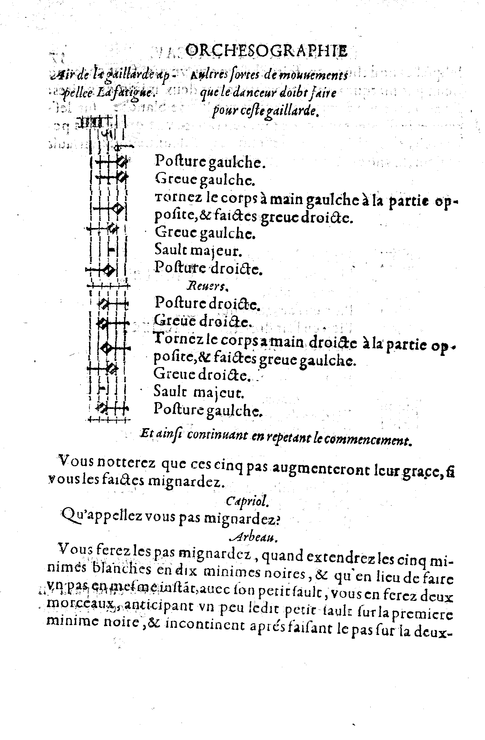 | Air de la gaillarde appellee La fatigue. | Aultres sortes de mouvements que le danceur doibt faire pour ceste gaillarde. |