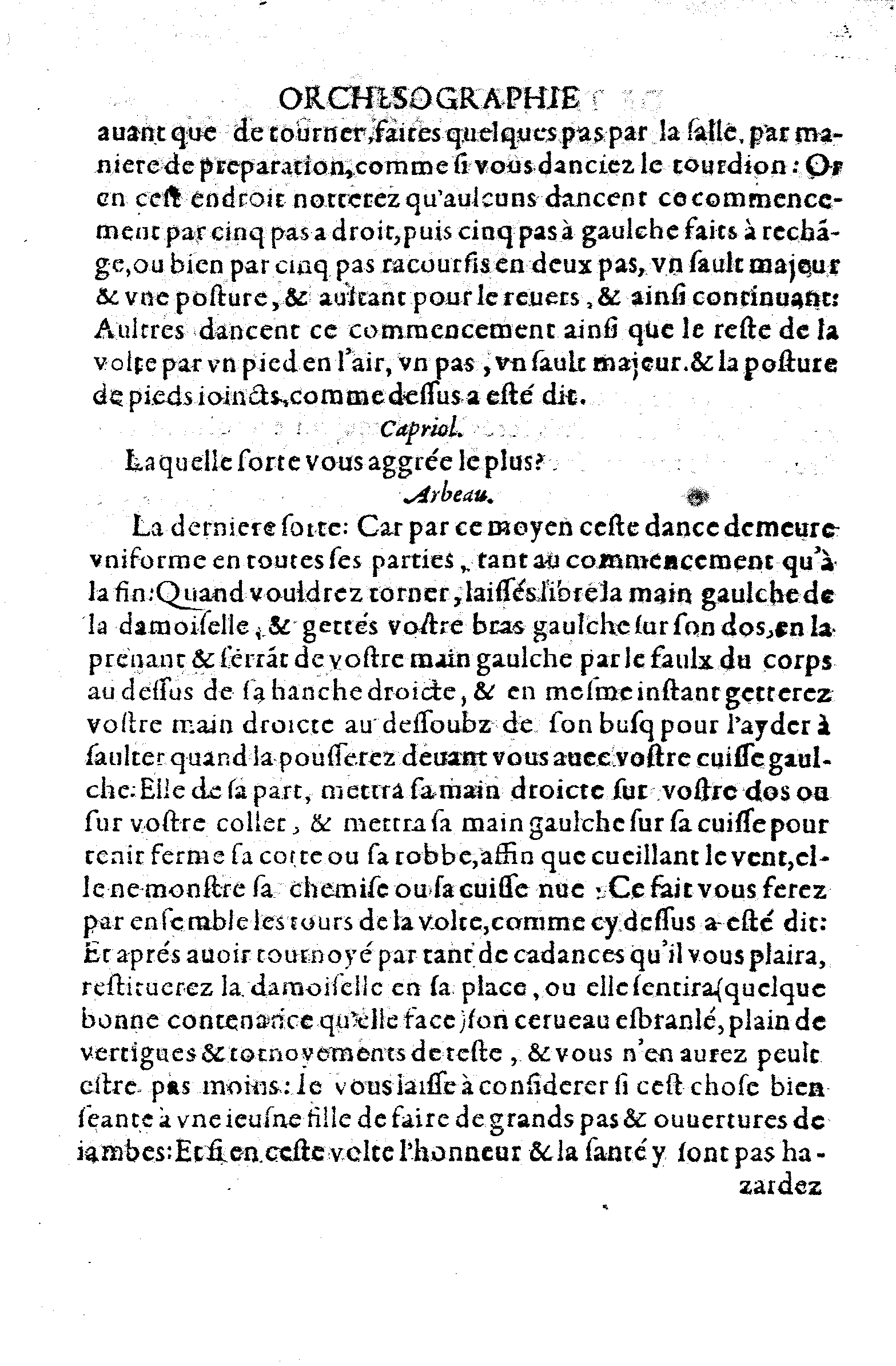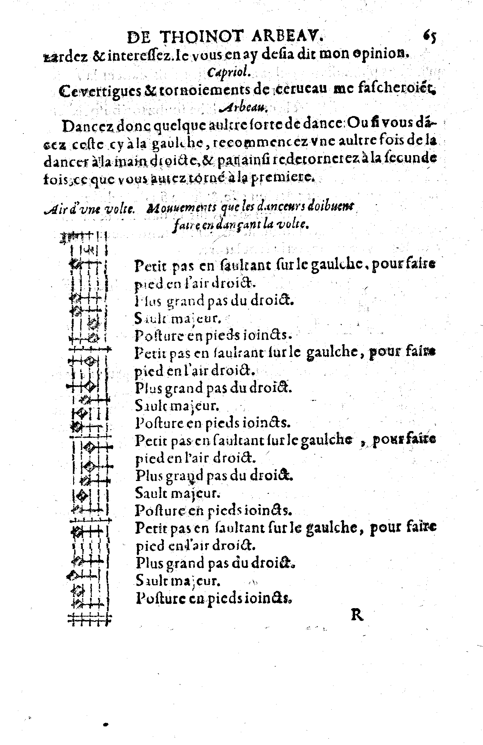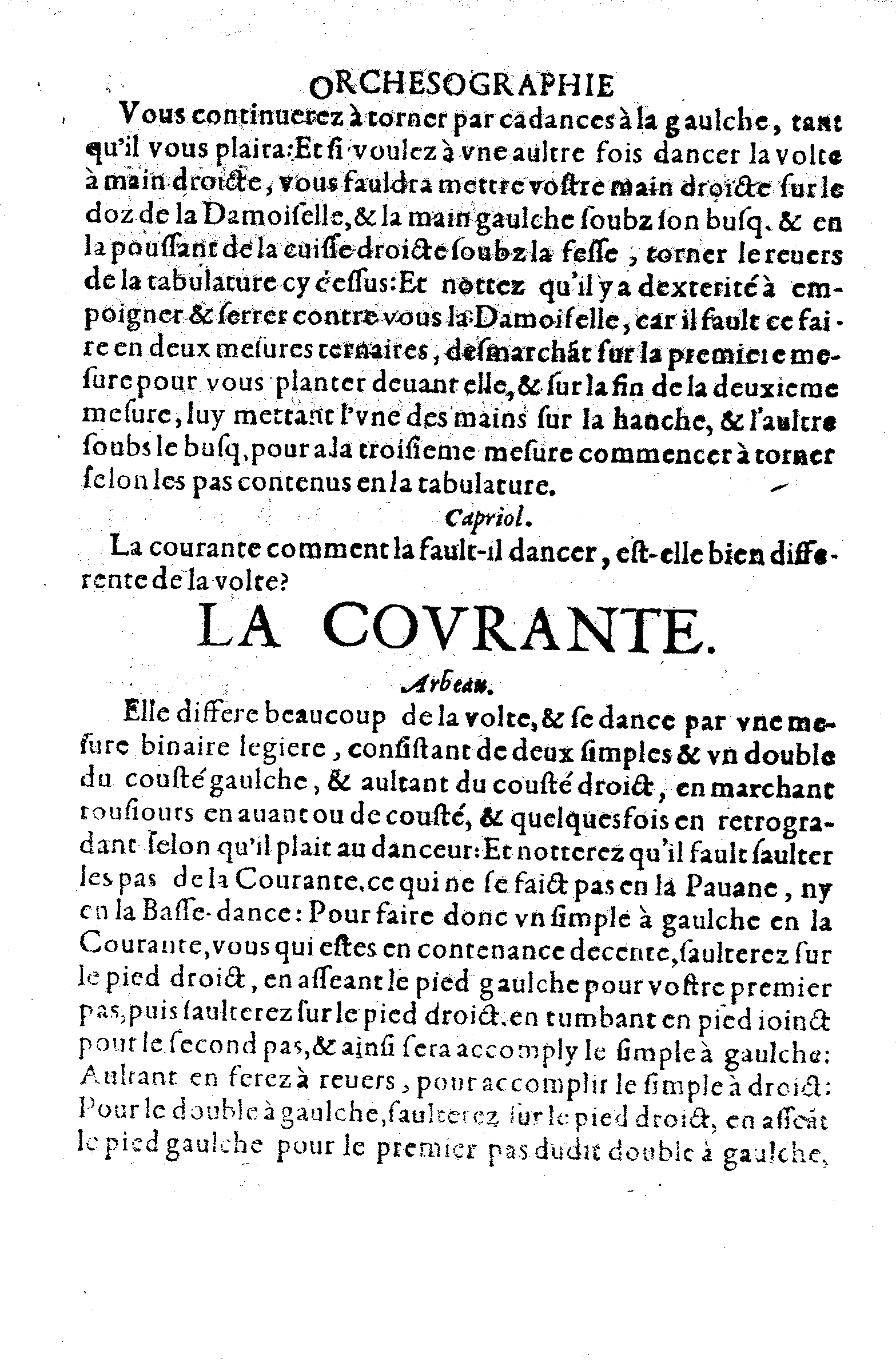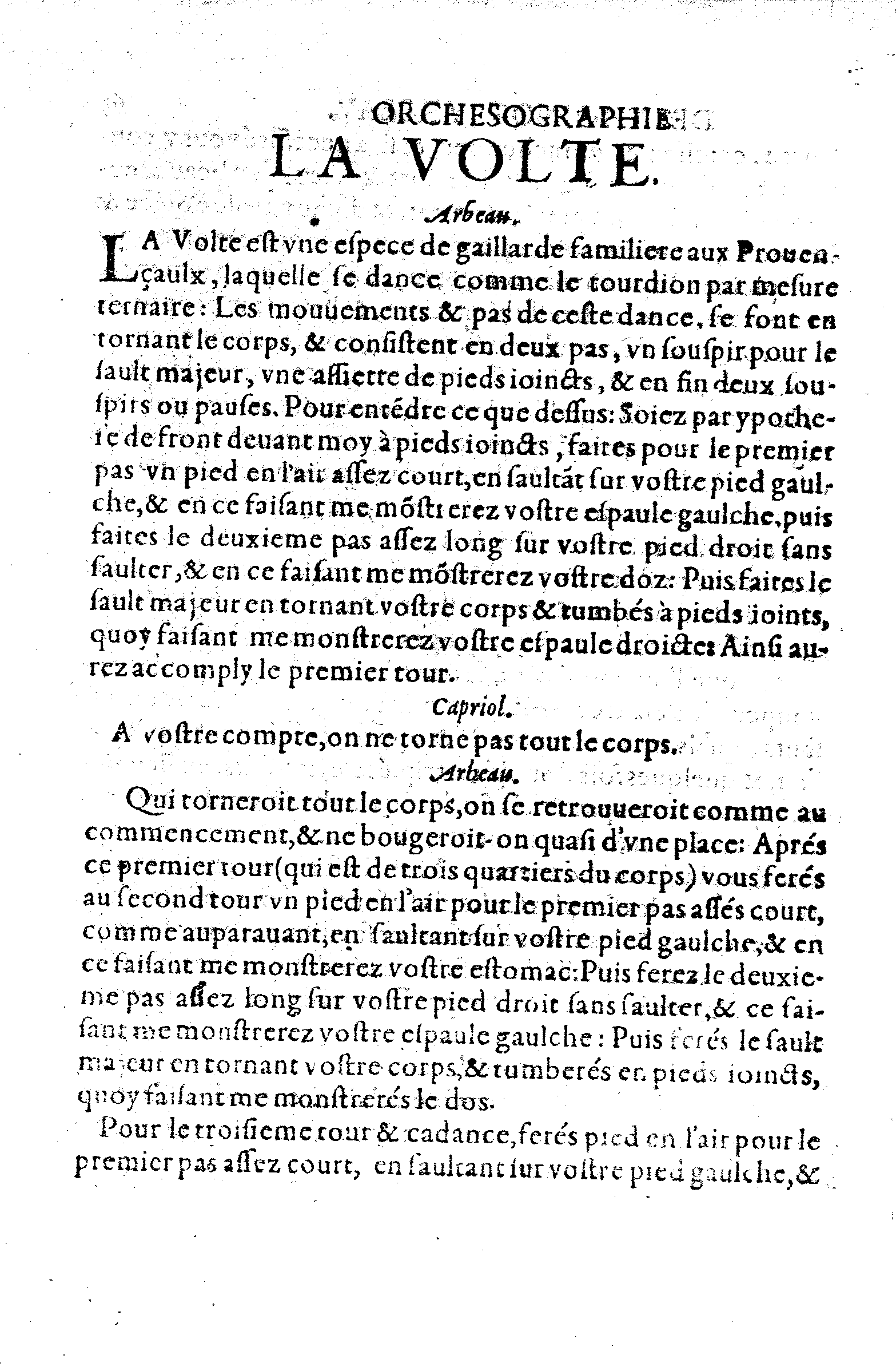La Volte est une espece de gaillarde familiere aux Provençaulx, laquelle se dance comme le tourdion par mesure ternaire: Les mouvements & pas de ceste dance, se font en tornant le corps, & consistent en deux pas, un souspir pour le sault majeur, une assiette de pieds joincts, & en fin deux souspirs ou pauses. Pour entendre ce que dessus: Soiez par ypothese de front devant moy à pieds joincts, faites pour le premier pas un pied en l'air assez court, en saultant sur vostre pied gaulche, & en ce faisant me monstrerez vostre espaule gaulche, puis faites le deuxieme pas assez long sur vostre pied droit sans saulter, & en ce faisant me monstrerez vostre doz: Puis faites le sault majeur en tornant vostre corps & tumbés à pieds joints, quoy faisant me monstrerez vostre espaule droicte: Ainsi aurez accomply le premier tour.