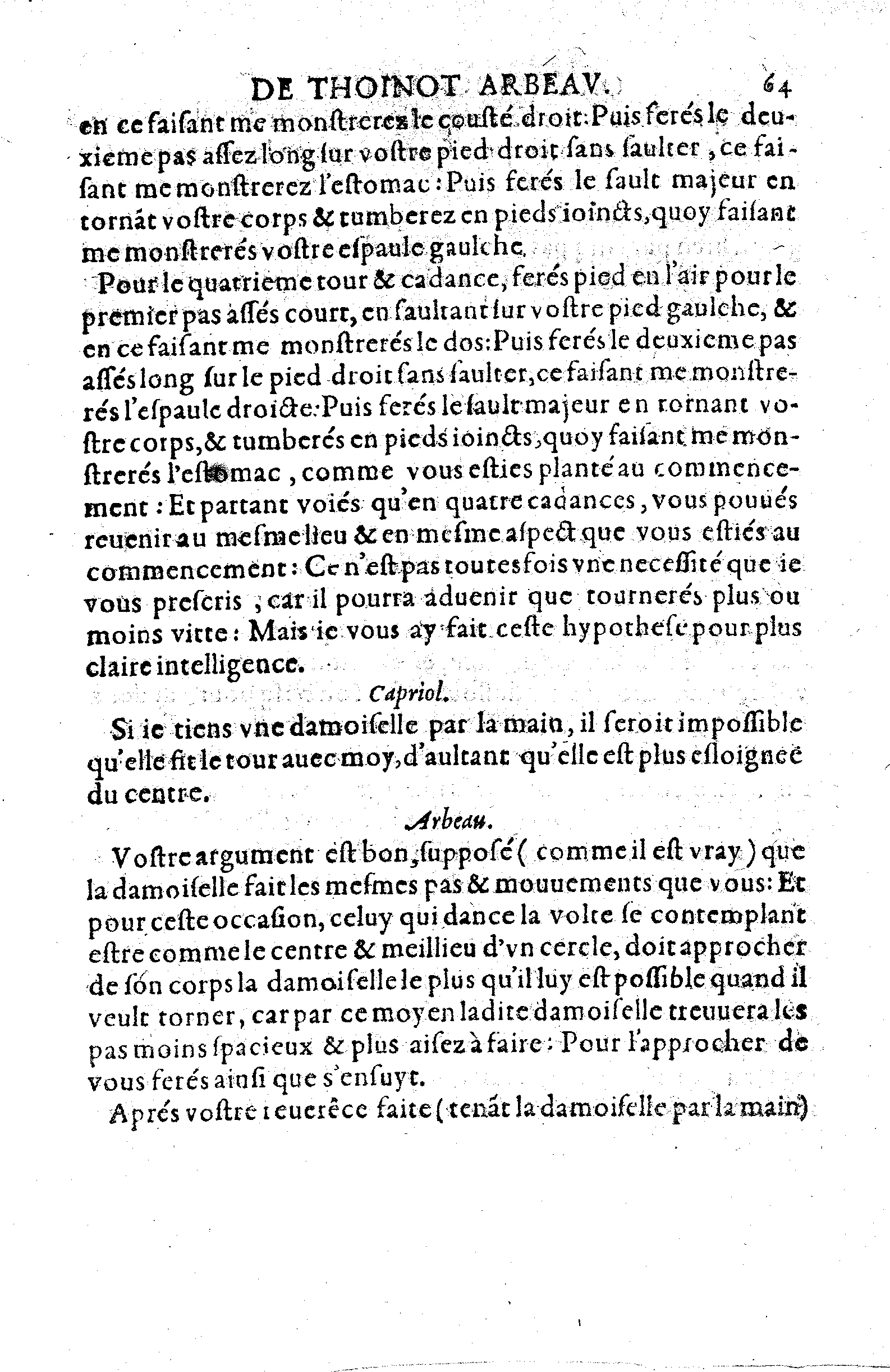 Pour le quatrieme tour & cadance, ferés pied en l'air pour le premier pas assés court, en saultant sur vostre pied gaulche, & en ce faisant me monstrerés le dos: Puis ferés le deuxieme pas assés long sur le pied droit sans saulter, ce faisant me monstrerés l'espaule droicte: Puis ferés le sault majeur en tornant vostre corps, & tumberés en pieds joincts, quoy faisant me monstrerés l'estomac, comme vous esties planté au commencement: Et partant voiés qu'en quatre cadances, vous pouvés revenir au mesme lieu & en mesme aspect que vous estiés au commencement: Ce n'est pas toutesfois une necessité que je vous prescris, car il pourra advenir que tournerés plus ou moins vitte: Mais je vous ay fait ceste hypothese pour plus claire intelligence.