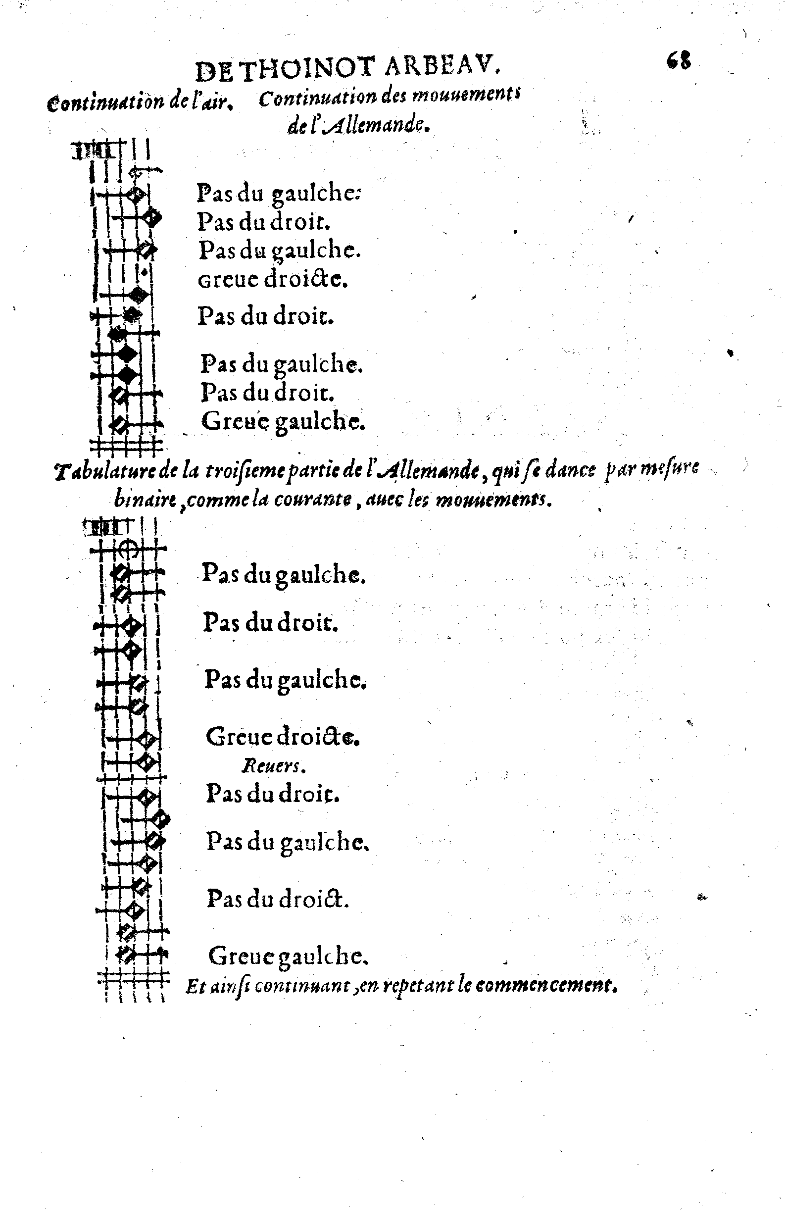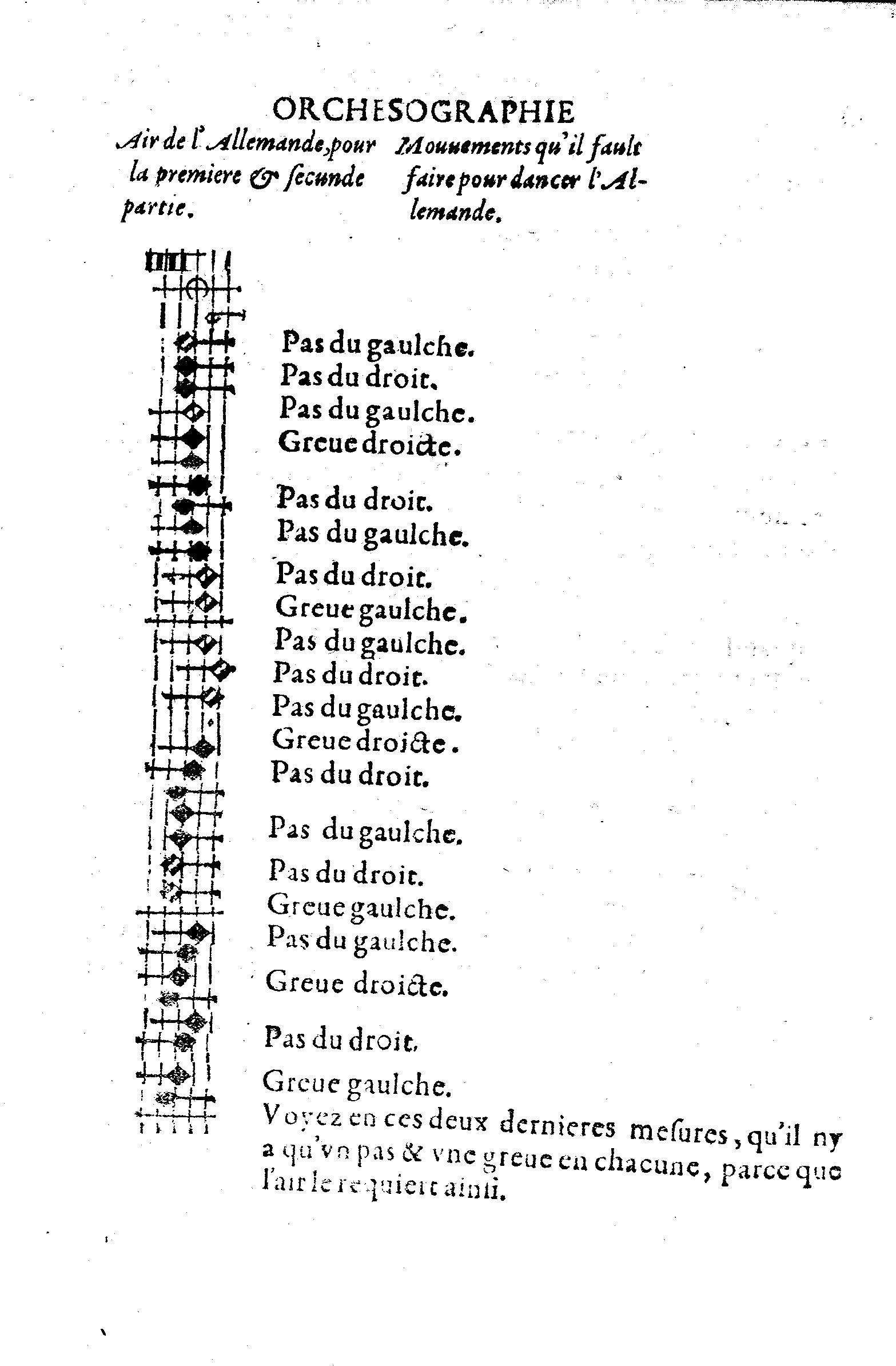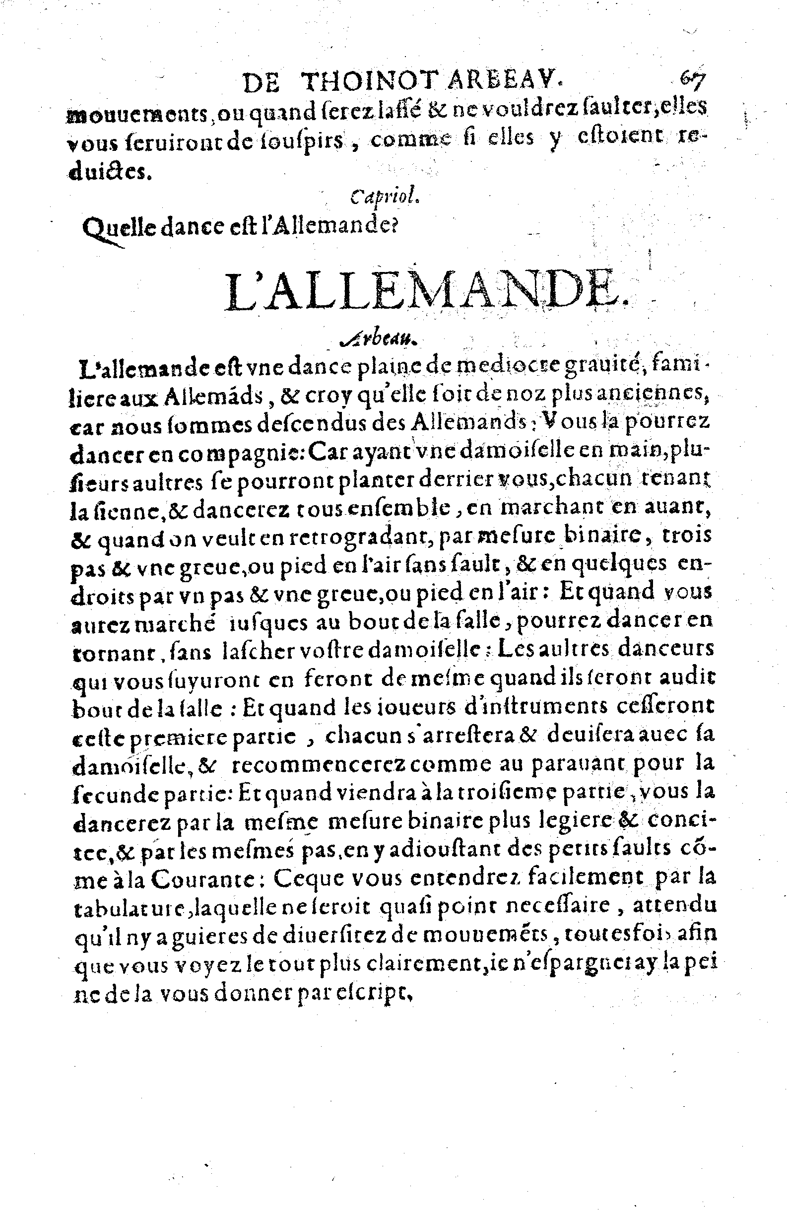 L'allemande est une dance plaine de mediocre gravité, familiere aux Allemands, & croy qu'elle soit de noz plus anciennes, car nous sommes descendus des Allemands: Vous la pourrez dancer en compagnie: Car ayant une damoiselle en main, plusieurs aultres se pourront planter derrier vous, chacun tenant la sienne, & dancerez tous ensemble, en marchant en avant, & quand on veult en retrogradant, par mesure binaire, trois pas & une greve, ou pied en l'air sans sault, & en quelques endroits par un pas & une greve, ou pied en l'air: Et quand vous aurez marché jusques au bout de la salle, pourrez dancer en tornant, sans lascher vostre damoiselle: Les aultres danceurs qui vous fuyvront en feront de mesme quand ils seront audit bout de la salle: Et quand les joueurs d'instruments cesseront ceste premiere partie, chacun s'arrestera & devisera avec sa damoiselle, & recommencerez comme au paravant pour la secunde partie: Et quand viendra à la troisieme partie, vous la dancerez par la mesme mesure binaire plus legiere & concitéé, & par les mesmes pas, en y adjoustant des petits saults comme à la Courante: Ceque vous entendrez facilement par la tabulature, laquelle ne seroit quasi point necessaire, attendu qu'il ny a guieres de diversitez de mouvements, toutesfois afin que vous voyez le tout plus clairement, je n'espargneray la peine de la vous donner par escript.