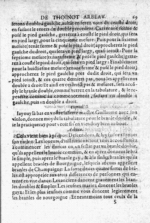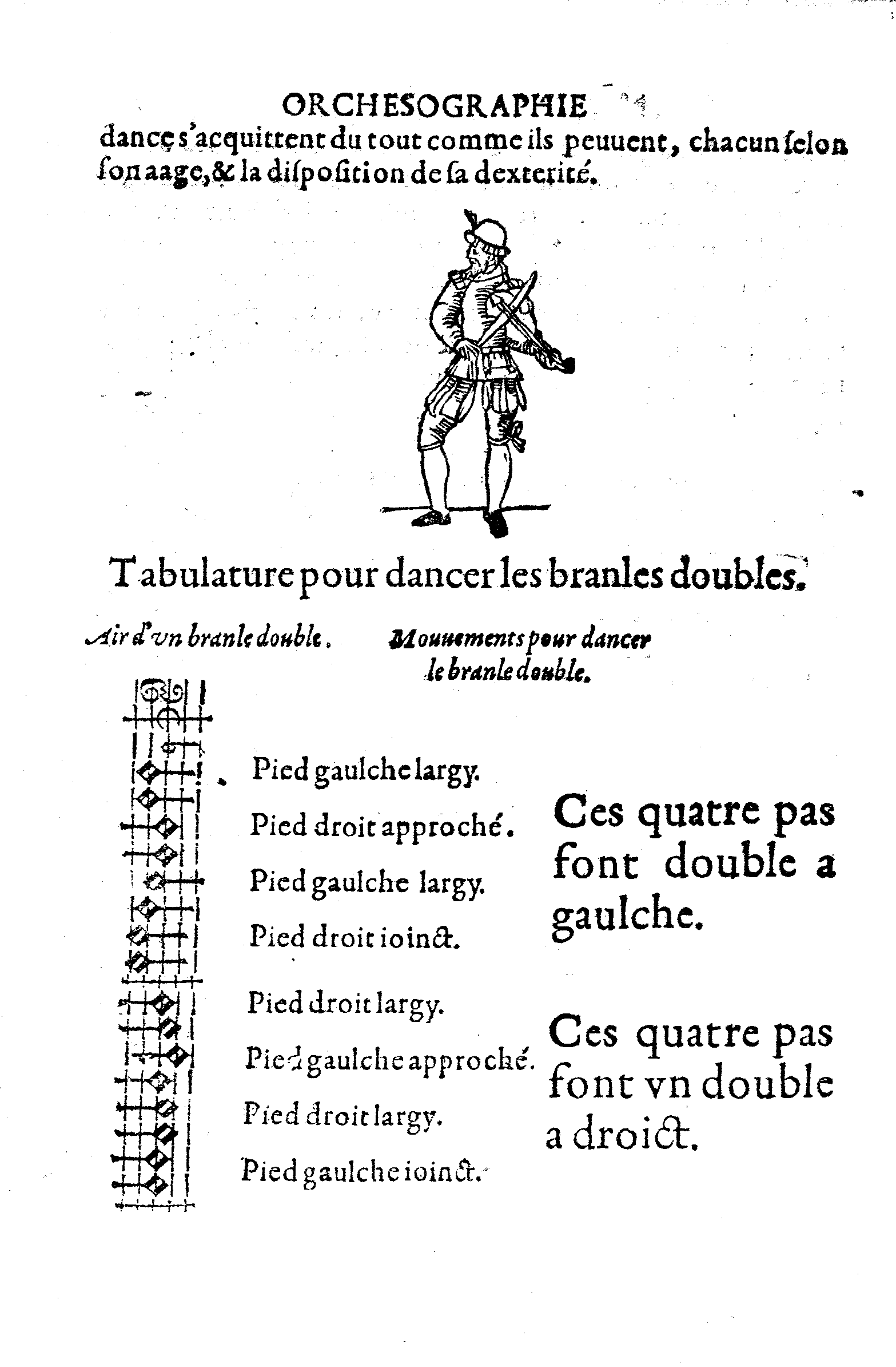 Ce branle double est bien facile à dancer: Mais il me semble que les danceurs ne bougent d'une place, d'aultant qu'ilz font a gaulche quatre pas, lesquels ils deffont a droit par aultres quatre pas.
