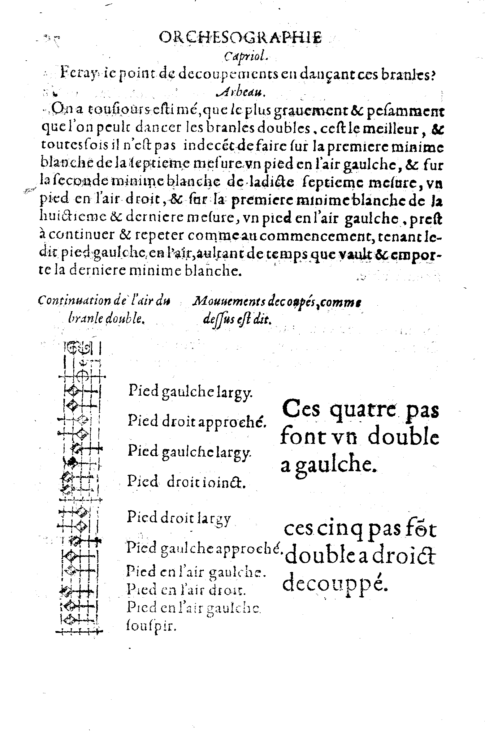On a tousjours estimé, que le plus gravement & pesamment que l'on peult dancer les branles doubles, cest le meilleur, & toutesfois il n'est pas indecent de faire sur la premiere minime blanche de la septieme mesure un pied en l'air gaulche, & sur la seconde minime blanche de ladicte septieme mesure, un pied en l'air droit, & sur la premiere minime blanche de la huictieme & derniere mesure, un pied en l'air gaulche, prest à continuer & repeter comme au commencement, tenant ledit pied gaulche en l'air, aultant de temps que vault & emporte la derniere minime blanche.