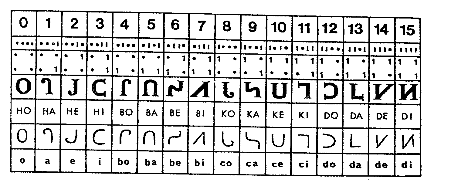 Les seize chiffres du bibi ne s'appellent pas platement zéro, un, deux, trois, quatre, cinq, six, sept, huit, neuf, a, bé, cé, dé, eu, effe comme ceux de l'hexadécimal mais portent des noms poétiques qui en font tout l'attrait : HO (0), HA (1), HE (2), HI (3), BO (4), BA (5), BE (6), BI (7), KO (8), KA (9), KE (10), KI (11), DO (12), DA (13), DE (14), DI (15).